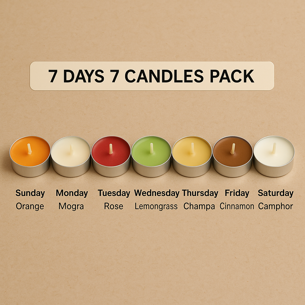 Illuminate your spiritual journey with our 7 Days 7 Candles Pack, a collection of handcrafted T-Light Candles made from pure natural wax and premium essential oils. Each candle is meticulously designed to align with the spiritual energy of the day, invoking divine blessings and positive vibrations.