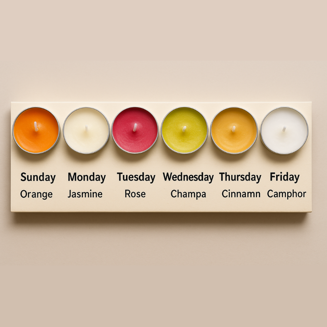 Each fragrance is carefully selected based on Vedic traditions to resonate with the deity and celestial alignment of the day: